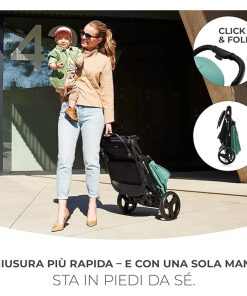 PIEGHEVOLE: RINE si chiude facilmente con una mano per poterlo riporre nel bagagliaio della macchina o in casa. Il passeggino mantiene la posizione verticale dopo la chiusura.